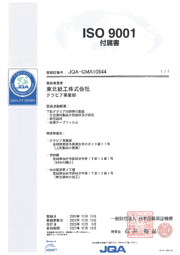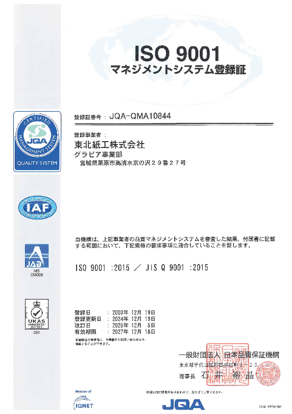 国際規格ISO9001は取得していますか? 投稿公開日:2012年6月26日 投稿カテゴリー:Q&A / フィルムパッケージ・グラビア印刷について / 弊社について グラビア事業部を対象に、食品軟包装資材、生活資材製品の包装資材などのグラビア印刷製品の製造について、国際規格ISO9001(品質マネジメントシステム)を取得いたしました。 厳しい安全性が求められる食品用フィルムパッケージなどでも高度な品質マネジメントをお約束いたします。 おすすめ ピロケースとはどんな形状ですか? 2013年8月9日 10色グラビア輪転印刷機の仕様は? 2013年10月14日 残留溶剤の検査はしていますか? 2013年9月16日
